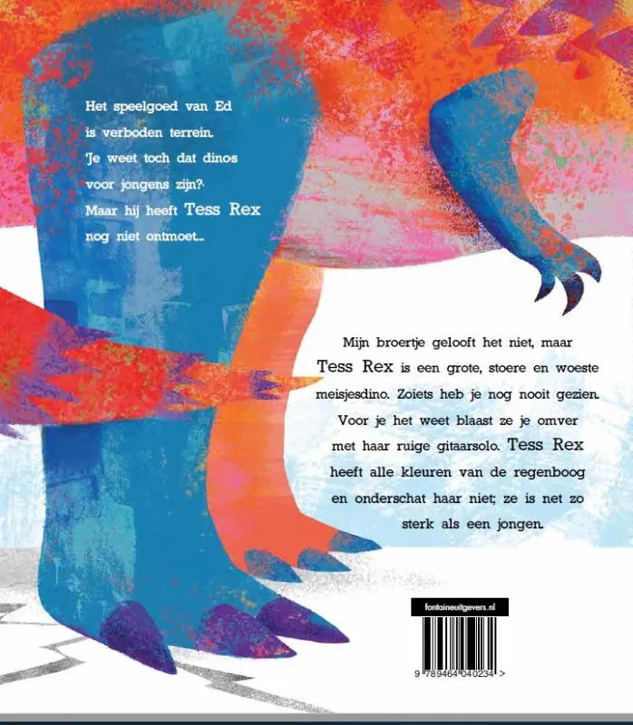 Ed wil zijn zusje niet met zijn speelgoed laten spelen. Zijn speelgoed is namelijk niet voor meisjes. En zeker niet met zijn dino’s, die zijn toch voor jongens? Maar Ed snapt er helemaal niks van. Want ineens duikt Tess op, zij is een T-Rex met alle kleuren van de regenboog. En een rokje. Maar onderschat haar niet! Ze is net zo groot, woest en fel als alle jongensdino’s. Ook meisjesdino’s kunnen stoer zijn!