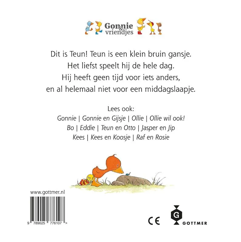 Dit is Teun! Teun is een klein, bruin gansje, en hij speelt de hoofdrol in dit kartonboekje voor peuters uit de ‘Gonnie en vriendjes’-serie. Het liefst speelt hij de hele dag. Hij heeft geen tijd voor iets anders, en al helemaal niet voor een middagslaapje. Hij rent en stuitert en speelt de hele dag, en hij is nóóit moe. Hoor. Herkenbaar?