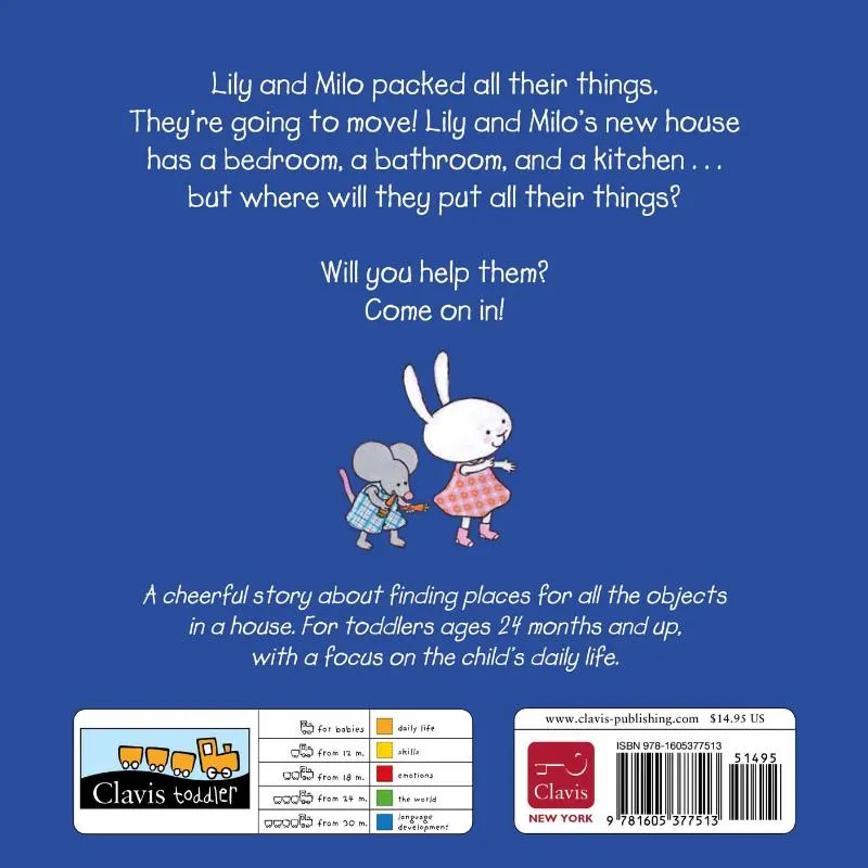 Als Lily en Milo gaan verhuizen, moeten ze bedenken welke spulletjes in welke kamer thuishoren. Moet hun bedje in de keuken staan? En hoort die tuinslang in de woonkamer? Prentenboek met paginagrote illustraties in heldere kleuren. Vanaf ca. 2 jaar.