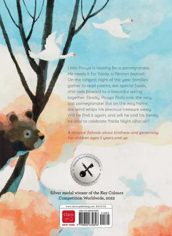 Little Pouya is looking for a pomegranate. He needs it for Yalda, a Persian festival celebrated on the longest night of the year. To celebrate, families gather to read poems, eat special foods, and look forward to a beautiful spring together. Finally, Pouya finds one: the very last pomegranate! But on the way home, the wind whips his precious treasure away. Will he find it again, and will he and his family be able to celebrate Yalda night after all? A magical folktale about kindness and generosity. For children ages 5 years and up.