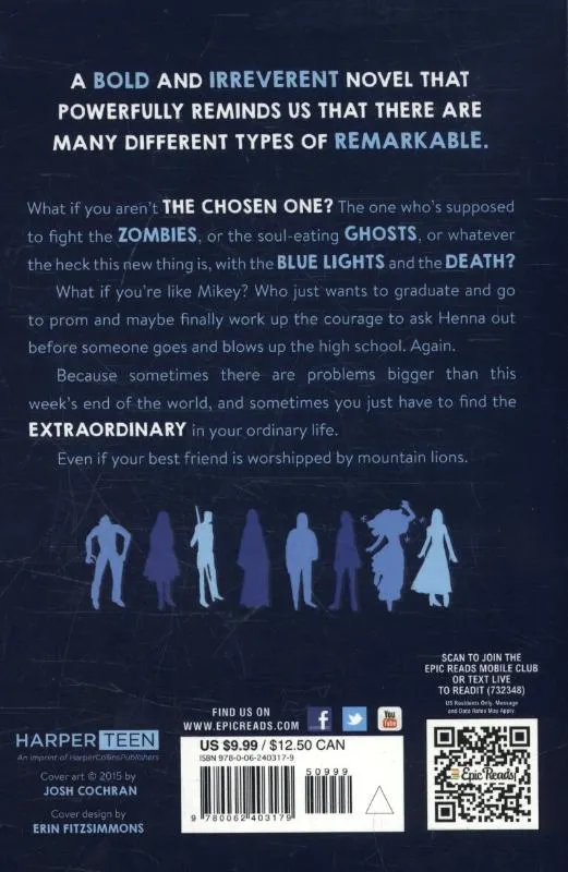 Six starred reviews! A bold and irreverent YA novel that powerfully reminds us that there are many different types of remarkable, The Rest of Just Live Here is from novelist Patrick Ness, author of the Carnegie Medal- and Kate Greenaway Medal-winning A Monster Calls and the critically acclaimed Chaos Walking trilogy.What if you aren’t the Chosen One? The one who’s supposed to fight the zombies, or the soul-eating ghosts, or whatever the heck this new thing is, with the blue lights and the death?What if you’re like Mikey? Who just wants to graduate and go to prom and maybe finally work up the courage to ask Henna out before someone goes and blows up the high school. Again.Because sometimes there are problems bigger than this week’s end of the world, and sometimes you just have to find the extraordinary in your ordinary life.Even if your best friend is worshipped by mountain lions.ALA Best Fiction for Young Adults * Cooperative Children’s Book Center CCBC Choice * Michael Printz Award shortlist * Kirkus Best Book of the Year * VOYA Perfect Ten * NYPL Top Ten Best Books of the Year for Teens * Chicago Public Library Best Teen Books of the Year * Publishers Marketplace Buzz Books * ABC Best Books for Children * Bank Street Best Books List
