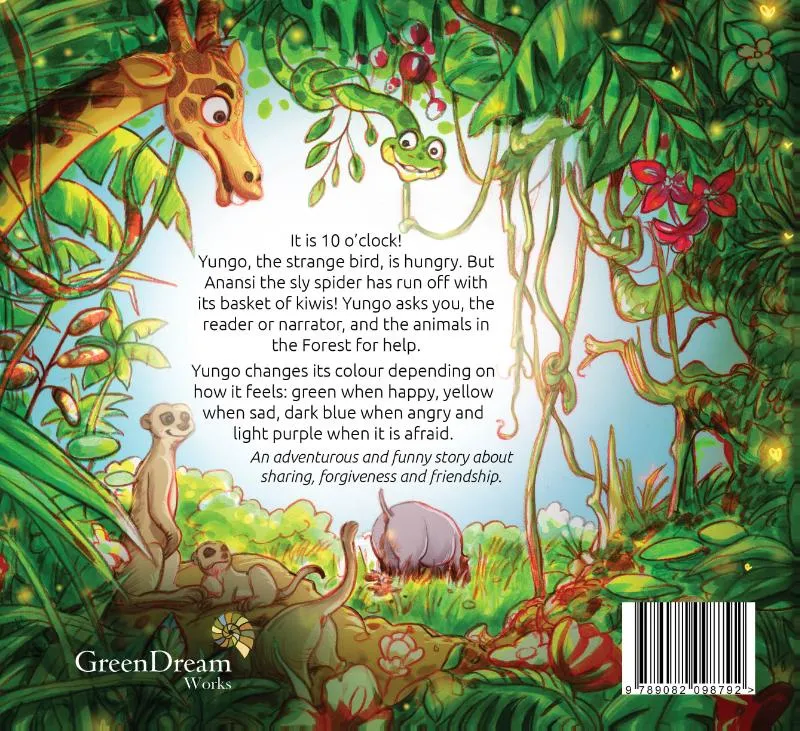It is 10 o’clock! Yungo, the strange bird, is hungry. But Anansi the sly spider has run off with its basket of kiwis! Yungo asks you, the reader or narrator, and the animals in the Forest for help.