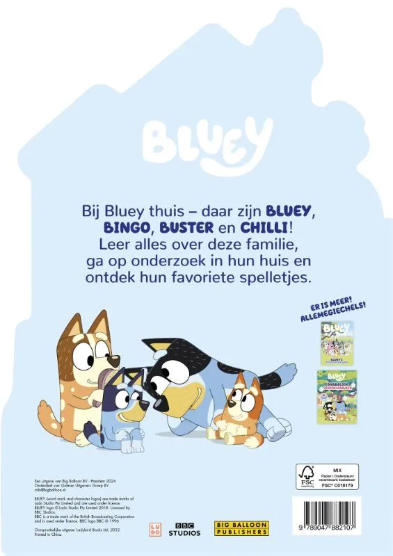 Het bijzondere Bluey-prentenboek ‘Thuis bij Bluey’ heeft de vorm van een huis! Maak kennis met de familie Heeler, ontmoet Bluey, haar zusje Bingo en hun ouders Chilli en Buster. Ze zijn allemaal dol op spelletjes en Bluey en Bingo houden het liefst hun vader voor de gek. Na een lange dag werken, school en spelen, eet de familie altijd gezellig samen. Wanneer er magische asperges op het menu staan, kunnen er bijzondere dingen gebeuren… <br>Bluey is een lieve en energieke puppy die samen met haar zusje Bingo en hun vader en moeder woont. Door haar eindeloze energie en fantasie beleeft ze bijzondere avonturen en wordt er veel gespeeld en gelachen met haar vrienden en familie. ‘Bij Bluey thuis’ is een stevig kartonboek voor PAW patrol-fans vanaf 2 jaar.<br><br>Bluey is een Australische animatieserie voor kleuters. De serie is een wereldwijde hit waar zowel boekuitgaven als speelgoed heel goed verkopen. Bluey wordt gezien als de tweede Peppa Pig. De serie wordt in Nederland en België uitgezonden op Disney Channel en Disney+.