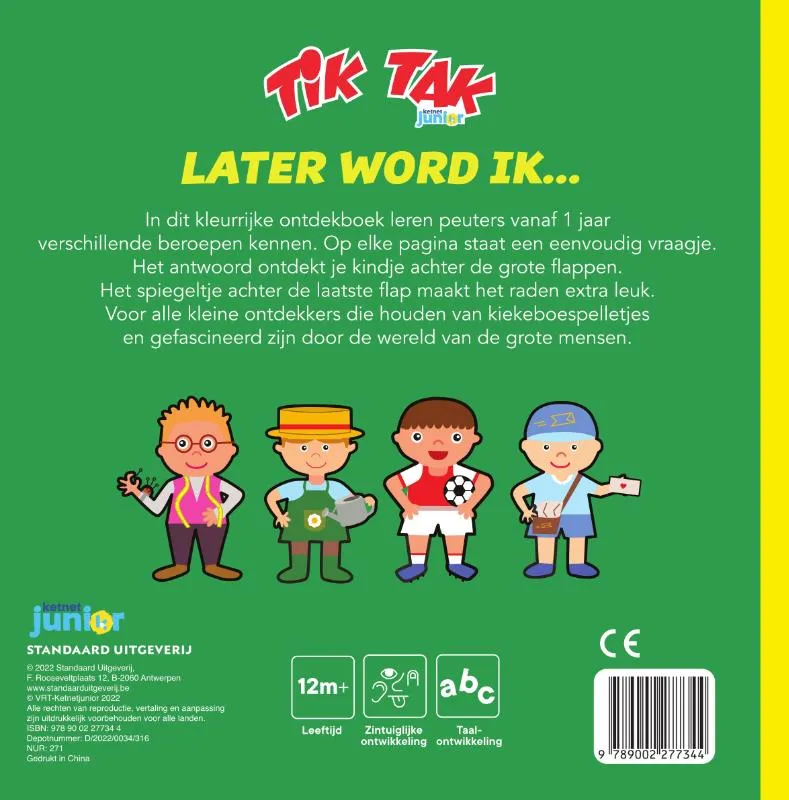 In dit kleurrijke ontdekboek leren peuters vanaf 1 jaar verschillende beroepen kennen. Op elke pagina staat een eenvoudig vraagje. Het antwoord ontdekt je kindje achter de grote flappen. Het spiegeltje achter de laatste flap maakt het raden extra leuk. Voor alle kleine ontdekkers die houden van kiekeboespelletjes en gefascineerd zijn door de wereld van de grote mensen.