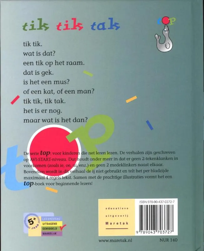 tik tik. wat is dat? een tik op het raam. dat is gek. is het een mus? of een kat, of een man? tik tik, tik tak. het is er nog. maar wat is het dan?