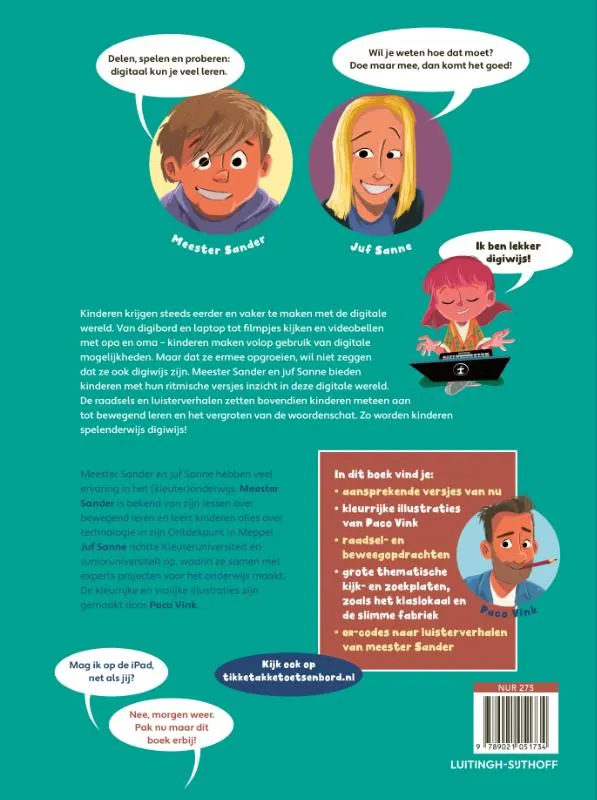 Tikke takke toetsenbord van meester Sander en juf Sanne is een interactief versjesboek voor jonge kinderen die opgroeien in de digitale wereld van nu. Van laptop, smartwatch en robotstofzuiger tot slimme tuinsproeier, zonnepaneel en Bee-Bot – allerlei slimme apparaten komen aan bod in dit eigentijdse versjesboek met fullcolourillustraties van Paco Vink.<br> <br> Met hun ritmische versjes brengen meester Sander en juf Sanne niet alleen de digitale wereld dichter bij de kinderen, maar spelen ze ook meteen in op het bewegend leren en het vergroten van de woordenschat. Het boek zit vol met raadsel- en beweegversjes, fullcolourzoekplaten van Paco Vink, QR-codes naar audio-opnamen van meester Sander en thema's als het slimme huis, de stad, de boerderij en de klas. Dit versjesboek is uitgevoerd in stevig karton met ronde hoeken en in een groot formaat – zo kan het jarenlang mee!<br> <br> Volg meester Sander en juf Sanne ook op sociale media:<br> @meestersander.nl<br> @jufsannecom<br> <br> <br> <br> <br>