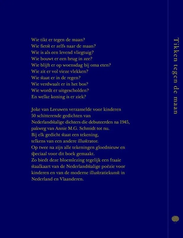 Joke van Leeuwen verzamelde voor kinderen vijftig schitterende gedichten van Nederlandstalige dichters die debuteerden na 1945, pakweg van Annie M.G. Schmidt tot nu. Bij elk gedicht staat een tekening, telkens van een andere illustrator.