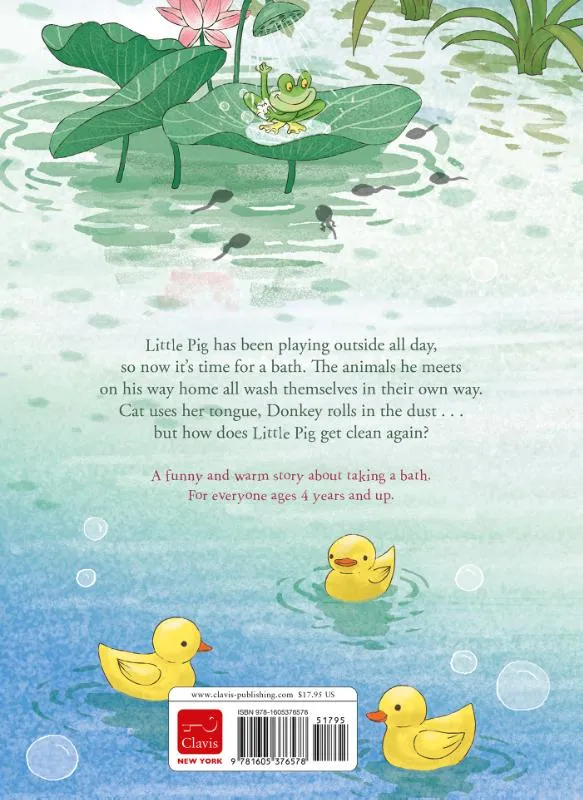 Little Pig has been playing outside all day, so now it’s time for a bath. The animals he meets on his way home all wash themselves in their own way. Cat uses her tongue, Donkey rolls in the dust . . . but how does Little Pig get clean again? A funny and warm story about taking a bath. For everyone ages 4 years and up.