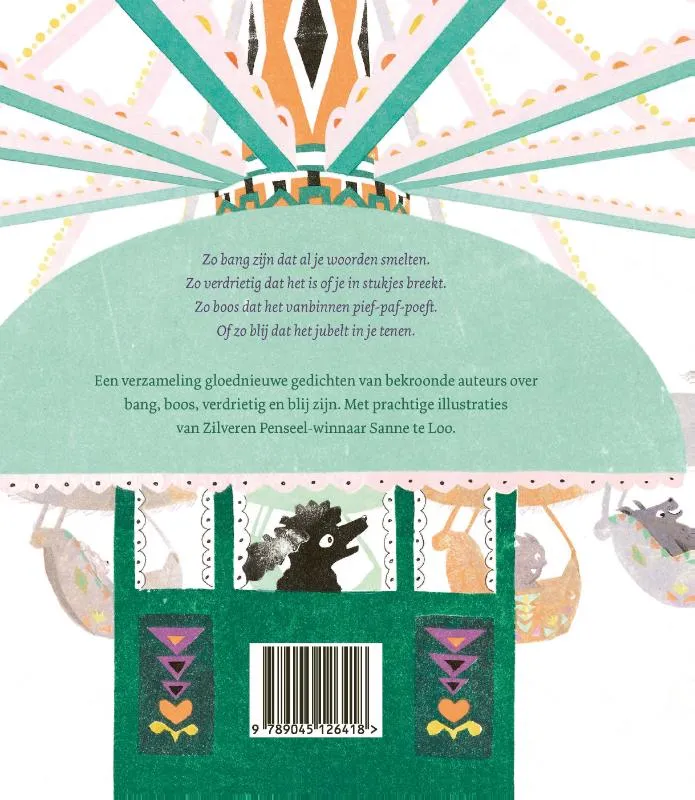 Zo bang zijn dat al je woorden smelten. Zo verdrietig dat het is of je in stukjes breekt. Zo boos dat het vanbinnen pieftpaft- poeft. Of zo blij dat het jubelt in je tenen. Heimwee, driftbuien, verlegen zijn: gevoelens zijn soms best ingewikkeld. In deze verzameling gedichten worden de vier basisemoties op een voor jonge kinderen herkenbare manier verwoord en verbeeld.