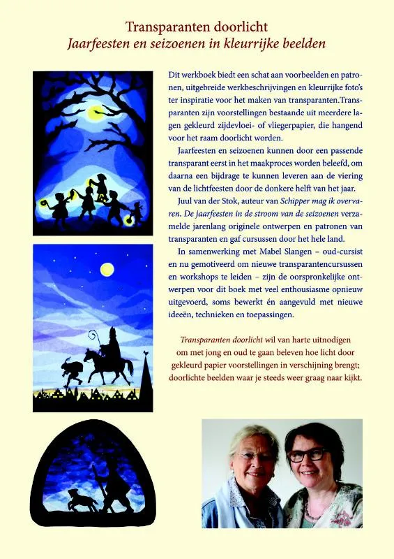 Dit werkboek biedt een schat aan voorbeelden en patronen, uitgebreide werkbeschrijvingen en kleurrijke foto’s ter inspiratie voor het maken van transparanten.Transparanten zijn voorstellingen bestaande uit meerdere lagen gekleurd zijdevloei- of vliegerpapier, die hangend voor het raam doorlicht worden.Jaarfeesten en seizoenen kunnen door een passende transparant eerst in het maakproces worden beleefd, om daarna een bijdrage te kunnen leveren aan de viering van de lichtfeesten door de donkere helft van het jaar.Juul van der Stok, auteur van Schipper mag ik overvaren. De jaarfeesten in de stroom van de seizoenen verzamelde jarenlang originele ontwerpen en patronen van transparanten en gaf cursussen door het hele land.In samenwerking met Mabel Slangen – oud-cursist en nu gemotiveerd om nieuwe transparantencursussen en workshops te leiden – zijn de oorspronkelijke ontwerpen voor dit boek met veel enthousiasme opnieuw uitgevoerd, soms bewerkt én aangevuld met nieuwe ideeën, technieken en toepassingen.Transparanten doorlicht wil van harte uitnodigen om met jong en oud te gaan beleven hoe licht door gekleurd papier voorstellingen in verschijning brengt; doorlichte beelden waar je steeds weer graag naar kijkt.