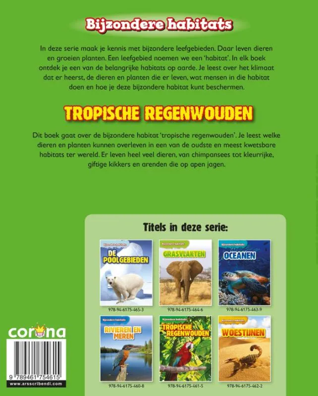 Dit boek gaat over de bijzondere habitat ’tropische regenwouden’. Je leest welke dieren en planten kunnen overleven in een van de oudste en meest kwetsbare habitats ter wereld. Er leven heel veel dieren, van chimpansees tot kleurrijke, giftige kikkers en arenden die op apen jagen.