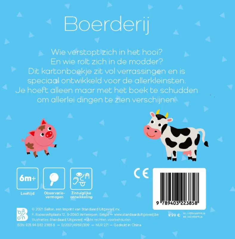 Dit kartonboekje zit vol verrassingen en is speciaal ontwikkeld voor de allerkleinsten. Je hoeft alleen maar met het boek te schudden om allerlei dingen te zien verschijnen. Bovendien is er ook een rammelaar aan het boekje bevestigd, zodat een leuk lees- én speelmoment verzekerd is.