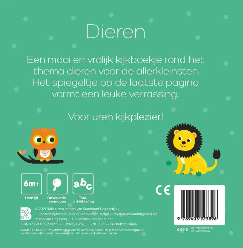 Een mooi en vrolijk kijkboekje rond het thema dieren voor de allerkleinsten. Het spiegeltje op de laatste pagina vormt een leuke verrassing.