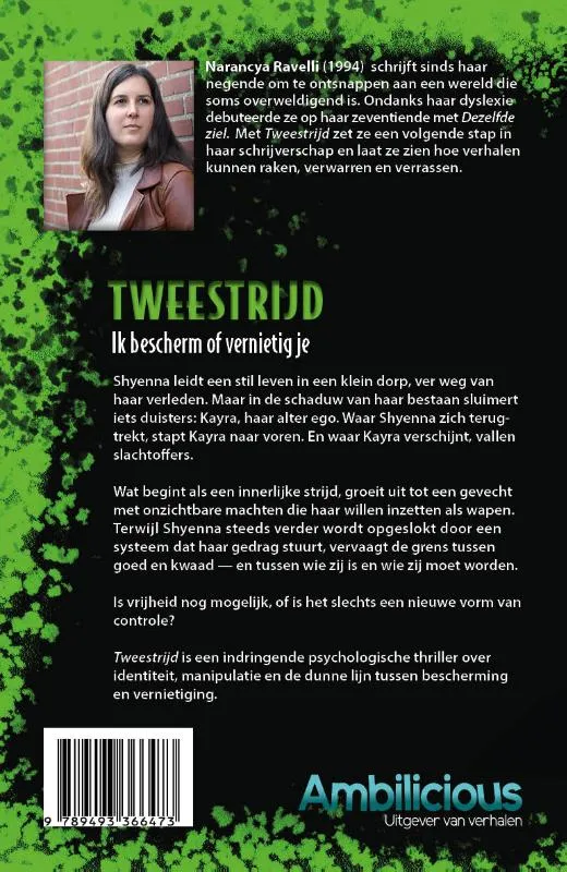 Tweestrijd; Ik bescherm of vernietig je: Shyenna leidt een stil leven in een klein dorp, ver weg van haar verleden. Maar in de schaduw van haar bestaan sluimert iets duisters: Kayra, haar alter ego. Waar Shyenna zich terugtrekt, stapt Kayra naar voren. En waar Kayra verschijnt, vallen slachtoffers. Wat begint als een innerlijke strijd, groeit uit tot een gevecht met onzichtbare machten die haar willen inzetten als wapen. Terwijl Shyenna steeds verder wordt opgeslokt door een systeem dat haar gedrag stuurt, vervaagt de grens tussen goed en kwaad — en tussen wie zij is en wie zij moet worden. Is vrijheid nog mogelijk, of is het slechts een nieuwe vorm van controle? ‘Tweestrijd’ is een indringende psychologische thriller over identiteit, manipulatie en de dunne lijn tussen bescherming en vernietiging.Narancya Ravelli: Narancya (1994) schrijft sinds haar negende om te ontsnappen aan een wereld die soms overweldigend is. Ondanks haar dyslexie debuteerde ze op haar zeventiende met Dezelfde ziel. Met ‘Tweestrijd’ zet ze een volgende stap in haar schrijverschap en laat ze zien hoe verhalen kunnen raken, verwarren en verrassen. ProBeeld (Ton de Koning) is verantwoordelijk voor de vormgeving van de omslag.