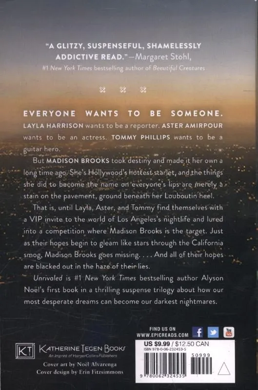 Everyone wants to be someone.Layla Harrison wants to leave her beach-bum days for digs behind a reporter’s desk. Aster Amirpour wants to scream at the next casting director who tells her ?we need ethnic but not your kind of ethnic.? Tommy Phillips dreams of buying a twelve-string guitar and using it to shred his way back into his famous absentee dad’s life.But Madison Brooks took destiny and made it her bitch a long time ago.She’s Hollywood’s hottest starlet, and the things she did to become the name on everyone’s lips are merely a stain on the pavement, ground beneath her Louboutin heel.That is, until Layla, Aster, and Tommy find themselves with a VIP invite to the glamorous and gritty world of Los Angeles’s nightlife and lured into a high-stakes competition where Madison Brooks is the target. Just as their hopes begin to gleam like stars through the California smog, Madison Brooks goes missing. . . . And all of their hopes are blacked out in the haze of their lies.Unrivaled is #1 New York Times bestselling author Alyson Noël’s first book in a thrilling suspense trilogy about how our most desperate dreams can become our darkest nightmares.Hollywood Boulevard is a place best viewed behind a pair of polarized lenses and lowered expectations.Yet if you know where to look (and if you’re fortunate enough to boast a spot on the guest list), it’s an oasis of the city’s hottest nightclubs?a hedonistic haven for the young, fabulous, and rich.But there’s no exiting through the gift shop if you buy a ticket to this show. Once you push past the velvet ropes and pulsing crowds, you might never escape.Praise for Unrivaled?Like a good celebrity, Unrivaled is mysterious and compelling and so gorgeous you won’t be able to look away.?? Cecily von Ziegesar, author of the Gossip Girl series?A glitzy, suspenseful, shamelessly addictive read.? ? Margaret Stohl, #1 New York Times bestselling author of Beautiful Creatures?If you love Pretty Little Liars, you’ll love this sexy teen drama where every choice poses a threat and nothing is what it seems.?? Kami Garcia, #1 New York Times bestselling authorof Beautiful Creatures and Unbreakable?Unrivaled will have you hooked from the very first page. Pure gold.??Jamie McGuire, #1 New York Times bestselling author of Beautiful Disaster?Unrivaled reveals the dark, grittier side of fame and leaves the reader caught in a web of suspense and lies.??#1 New York Times bestselling author Jennifer L. Armentrout