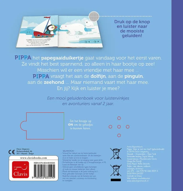 Een mooi Clavis Muziek-boek vol verrassende dieren en natuurgeluiden. Voor luistervinkjes en avonturiers vanaf 2 jaar.Pippa de papegaaiduiker is gek op varen. Wie wil er met haar mee? Pippa vraagt het aan de ijsbeer, de walvis, de pinguïns … maar niemand wil met haar mee. En jij? Kijk, zoek en luister je mee?