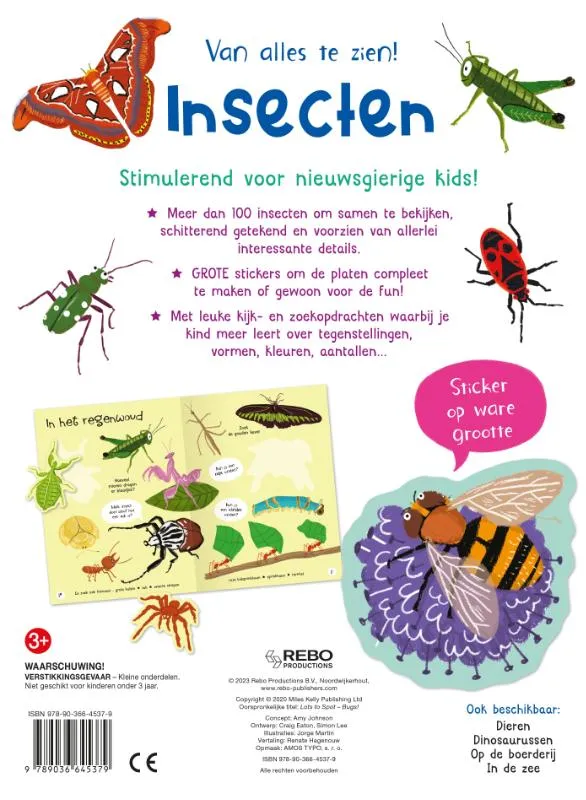 Stimulerend voor nieuwsgierige kids! Meer dan 100 insecten om samen te bekijken, schitterend getekend en voorzien van allerlei interessante details. GROTE stickers om de dierenplaten compleet te maken of gewoon voor de fun! Met leuke kijk- en zoekopdrachten waarbij je kind meer leert over tegenstellingen, vormen, kleuren, aantallen…