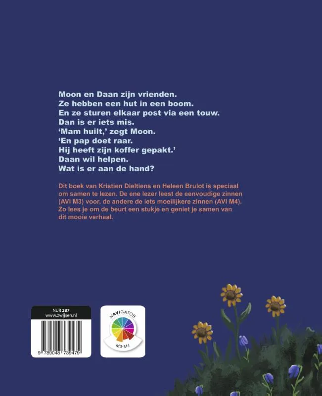 Dit herkenbare samenleesboek op AVI M3 en M4 is speciaal voor beginnende lezers. Je leest het verhaal over de vrienden Moon en Daan samen. De één leest de eenvoudige tekst op AVI M3 voor, de ander leest de iets moeilijkere tekst op AVI M4 voor. Zo lees je om de beurt een stukje en geniet je samen van het verhaal.