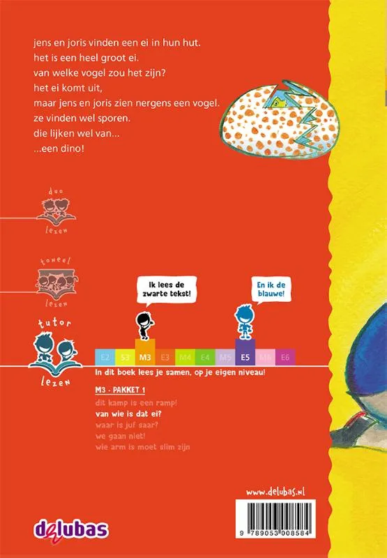 Van wie is dat ei? is een van de vijf boeken uit het M3 pakket 1 tutorlezen van Uitgeverij Delubas, speciaal ontwikkeld voor tutorlezen, met M3 als leesniveau voor de beginnende of zwakkere lezer.