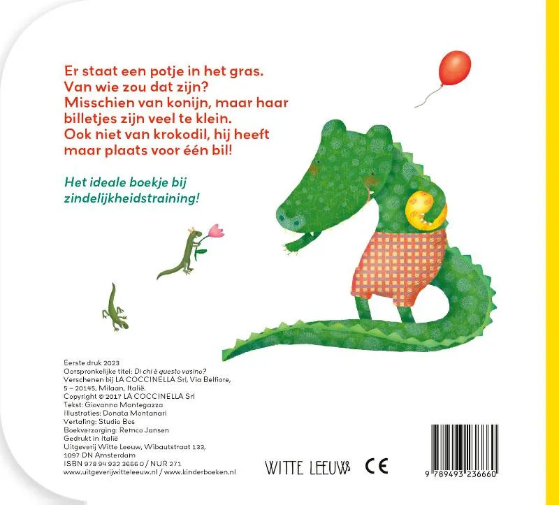 Van wie is het blauwe potje in de wei? Leuk om voor te lezen aan kinderen die bezig zijn zindelijk te worden. Prentenboek met paginagrote illustraties in vrolijke kleuren. Vanaf ca. 2 jaar.