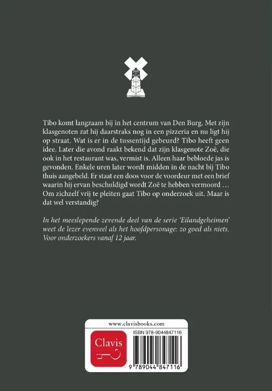 Tibo komt langzaam bij in het centrum van Den Burg. Met zijn klasgenoten zat hij daarstraks nog in een pizzeria en nu ligt hij op straat. Wat is er in de tussentijd gebeurd? Tibo heeft geen idee. Later die avond raakt bekend dat zijn klasgenote Zoë, die ook in het restaurant was, vermist is. Alleen haar bebloede jas is gevonden. Enkele uren later wordt midden in de nacht bij Tibo thuis aangebeld. Er staat een doos voor de voordeur met een brief waarin hij ervan beschuldigd wordt Zoë te hebben vermoord … Om zichzelf vrij te pleiten gaat Tibo op onderzoek uit. Maar is dat wel verstandig?