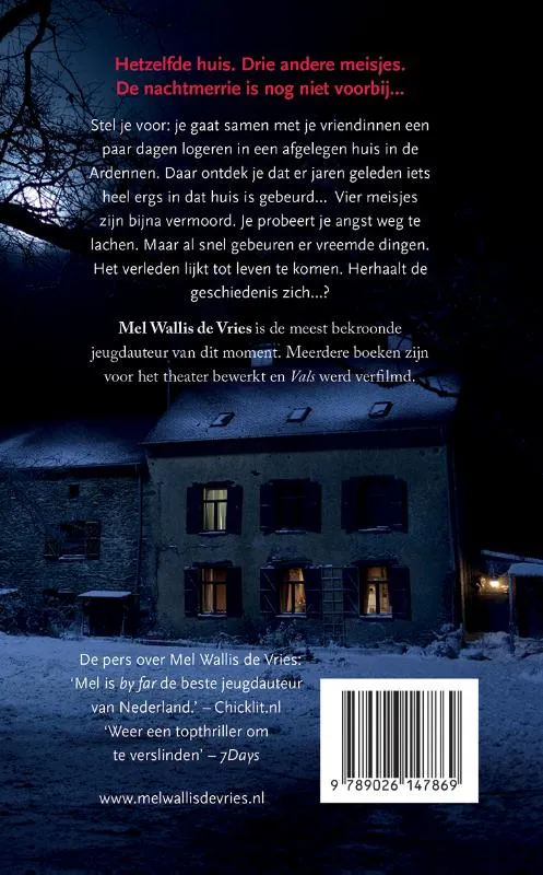 Vervolg op ‘Vals’. Drie meiden logeren in een huis waar ooit bijna meisjes waren vermoord. Al snel gebeuren er vreemde dingen. Herhaalt de geschiedenis zich? Jeugdthriller van Jonge Jury-winnares.