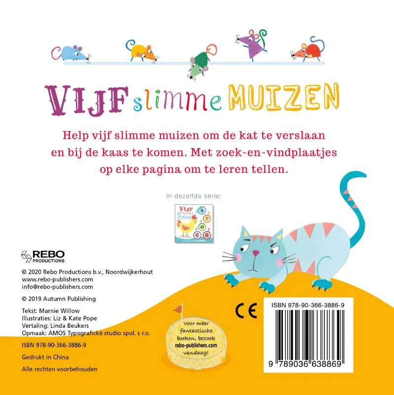 Help vijf slimme muizen om de kat te verslaan en bij de kaas te komen. Met zoek- en vindplaatjes op elke pagina om te leren tellen.