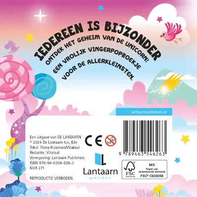 Ga jij met de eenhoorn mee op avontuur? Dit stevige kartonboek bevat een vingerpop van Unicorn met daarin een piepende verrassing! Iedere pagina bevat een vrolijk tekstje op rijm. Een vrolijk vingerpopboekje voor de allerkleinsten.