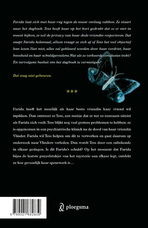Farida heeft het moeilijk nu haar vriendje en beste vriendin meer tijd met elkaar doorbrengen dan met haar. Maar dan ontmoet ze Tess, een meisje dat er net zo eenzaam uitziet als Farida zich voelt. Tess is pas echt ongelukkig: ze is zelfs opgenomen in een psychiatrische kliniek. De meisjes vinden steun bij elkaar en algauw ontstaat er een hechte vriendschap tussen de twee. Farida is blij dat zij en Tess elkaar zo goed kunnen helpen. Maar waarom wordt ze aan alle kanten voor Tess gewaarschuwd? En wat is er precies gebeurd met Vlinder, de overleden vriendin van Tess?
