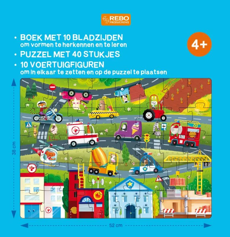 - 10 voertuigfiguren om in elkaar te zetten en op de puzzel te plaatsen