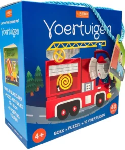 Box met een boek, puzzel en 10 voertuigfiguren voor kinderen om vormen te leren.