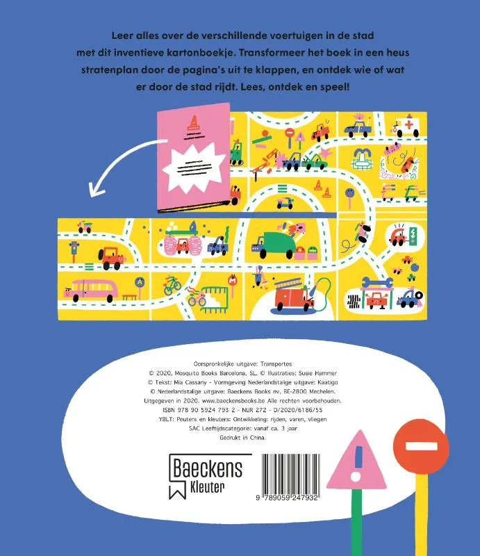 Ontdek welke voertuigen je ziet in de stad met dit vrolijke kartonboek. Op de achterkant van elke pagina wordt een stukje van een kaart getoond. Wanneer je het hele boek uitklapt, zal het volledige stratenplan tevoorschijn komen. Kleuters kunnen kijken, zoeken, de voertuigen volgen en routes bedenken. Ideaal om de verbeelding te stimuleren.