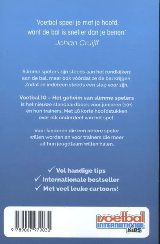 Voetbal IQ – Het geheim van slimme spelers is het nieuwe standaardboek voor junioren én hun trainers. Met 50 korte hoofdstukken over elk aspect van het spel. Voor kinderen die een betere speler willen worden en trainers die meer uit hun jeugdteam willen halen.