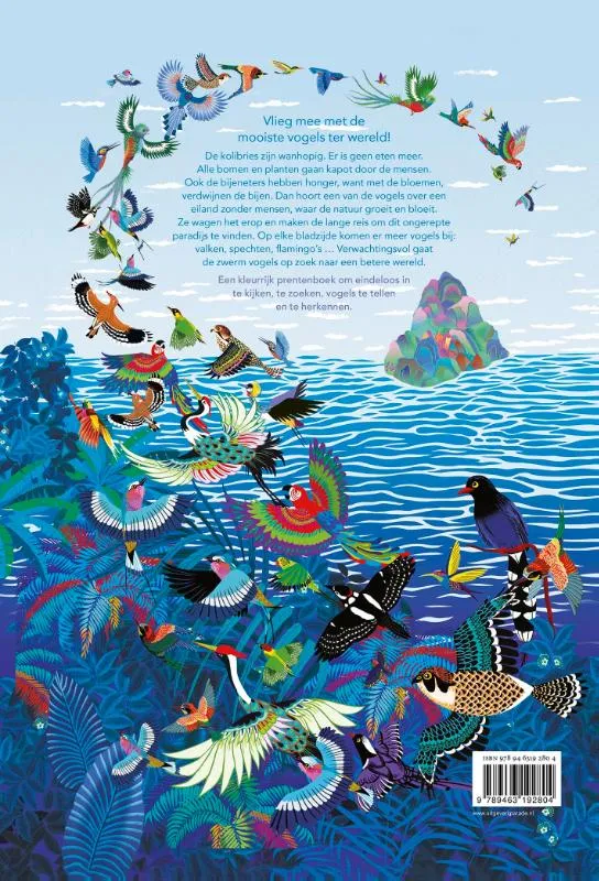 en insecten zijn om van te leven! Een van de kolibries heeft gehoord van een prachtig, van mensen afgeschermd eiland waar alle soorten in overvloed leven. De vogels besluiten een lange reis te ondernemen op zoek naar dit beloofde eiland. Van pagina tot pagina groeit de kleine zwerm. Valken, spechten en flamingo’s vliegen eensgezind, gedragen door hoop, en sieren de pagina’s van dit prachtige ecologische album met duizend kleuren.
