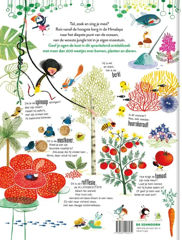 De allergrootste bloem ter wereld is prachtig … maar stinkt verschrikkelijk. Katjes en eikels horen bij dezelfde boom. En wist je dat er een trucje bestaat om te ontdekken of een spons een plant of een dier is? In dit wonderlijke kijkboek ontdek je informatie over de natuur, grappige personages die zich steeds opnieuw verstoppen en fragmenten van bekende liedjes. Reis mee vanaf de hoogste berg in de Himalaya naar het diepste punt van de oceaan. Of dwaal door de woeste jungle tot in je eigen moestuin.