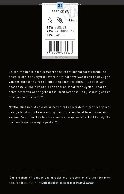 Voor Yasmin is onderdeel van de Best of YA | XS-reeks. Meer lezen uit deze reeks? Lees ook:• Mirjam Mous – Girl 6• Daniëlle Bakhuis – De laatste uren van Josephine Donkers• Buddy Tegenbosch – Mijn nacht met Vedder• Saskia Mouissie – De belofte• Mijke Pelgrim – Over straatfiguren en wegpiraten• Henk Hardeman – Wat gebeurde er met David?• Mirjam Mous – Welkom in Smartpark• Esther Walraven – Wind