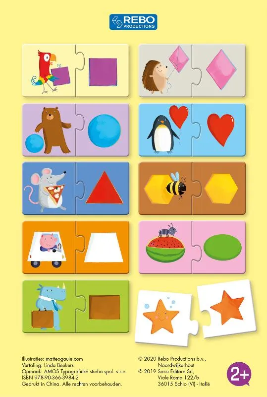 Leer alles over vormen met hulp van je dierenvriendjes! In deze box met hengsel om overal mee naar toe te nemen vind je een kartonnen boekje en 10 puzzels van 2 stukjes voor de leeftijd vanaf 2 jaar.