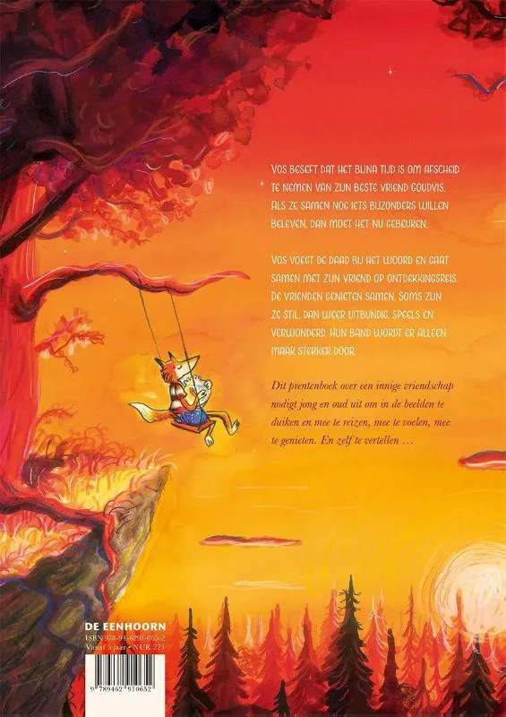 ‘Ah, Goudvis, misschien is het tijd. Maar zo kan ik je niet laten gaan’, zegt Vos. Vos neemt Goudvis mee en toont hem de hele wereld. Ze rijden met de motor Route 66 af, staan op het dak van de wereld, drinken limonade op de maan, trekken door het oerwoud … Als Goudvis alles heeft gezien, kan Vos zijn vriend eindelijk loslaten. Een vertederend prentenboek (bijna) zonder tekst.