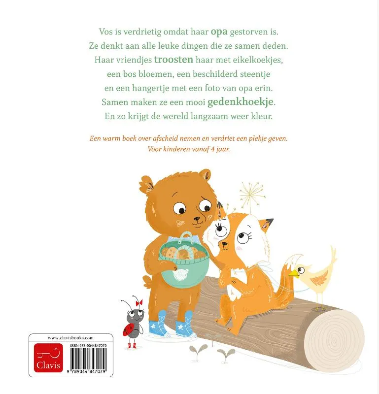Vos is verdrietig omdat haar opa gestorven is. Ze denkt aan alle leuke dingen die ze samen deden. Haar vriendjes troosten haar met eikelkoekjes, een bos bloemen, een beschilderd steentje en een hangertje met een foto van opa erin. Samen maken ze een mooi gedenkhoekje. En zo krijgt de wereld langzaam weer kleur.
