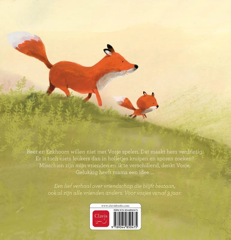 Beer en Eekhoorn willen niet met Vosje spelen. Dat maakt hem verdrietig. Er is toch niets leukers dan in holletjes kruipen en sporen zoeken? Misschien zijn mijn vrienden en ik te verschillend, denkt Vosje. Gelukkig heeft mama een idee …