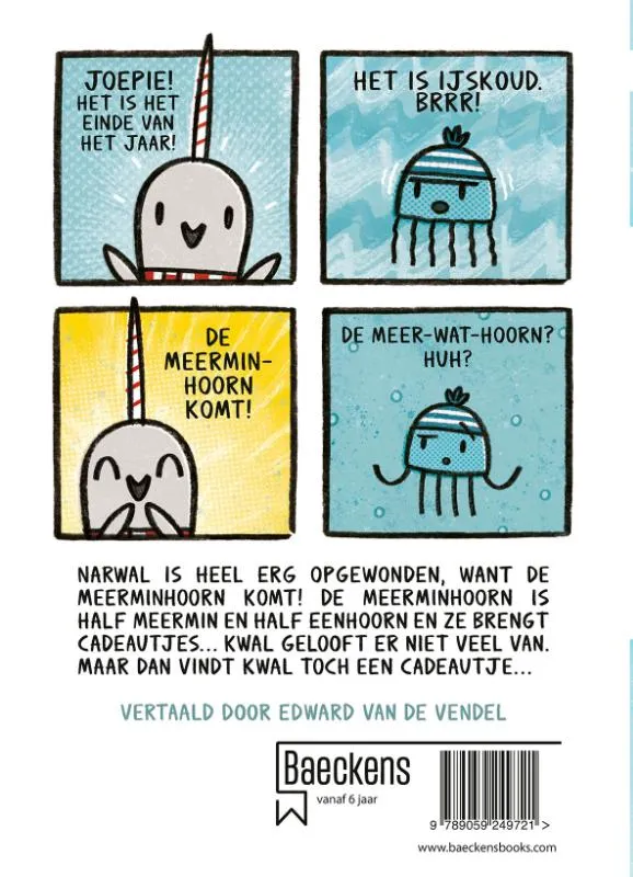 Narwal is heel erg opgewonden, want de meerminhoorn komt! De meerminhoorn is half meermin en half eenhoorn en ze brengt cadeautjes. Kwal gelooft er niet veel van. Maar dan vindt Kwal toch een cadeautje.