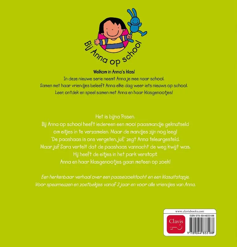 Het is Pasen. Maar … de paasmandjes zijn nog leeg! Volgens de juf heeft de paashaas zich vannacht vergist en alle eitjes per ongeluk in het park verstopt. De klas gaat meteen op zoek.