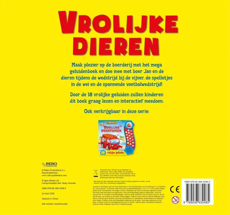 18 vrolijke geluiden. Maak plezier op de boerderij met dit mega geluidenboek en doe mee met boer Jan en de dieren tijdens de wedstrijd bij de vijver, de spelletjes in de wei en de spannende voetbalwedstrijd!