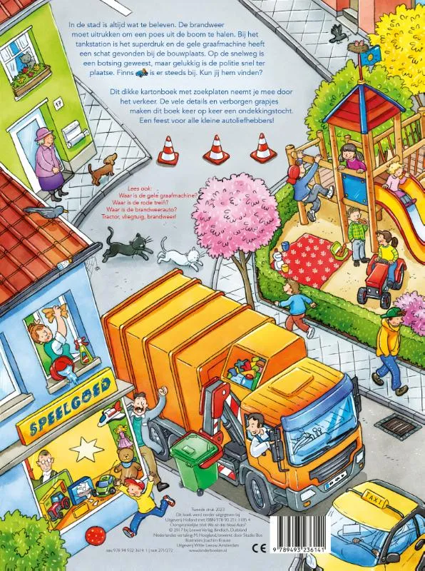 In de stad is altijd wat te beleven. De brandweer moet uitrukken om een poes uit de boom te halen. Bij het tankstation is het superdruk en de gele graafmachine heeft een schat gevonden bij de bouwplaats. Op de snelweg is een botsing geweest, maar gelukkig is de politie snel ter plaatse. Finns blauwe auto is er steeds bij. Kun jij hem vinden? <br>