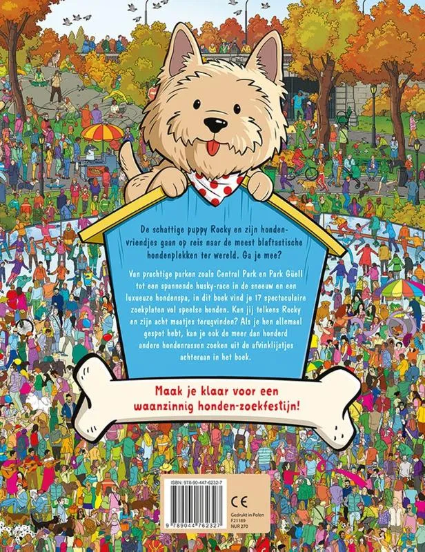 Zoek en vind Rocky de puppy en meer dan 100 andere hondenrassen op de spectaculaire platen vol speelse honden in dit zoekboek! Rocky en zijn hondenvriendjes gaan op reis naar de meest blaftastische hondenplekken ter wereld: van prachtige parken zoals Central park en park Güell tot een spannende husky-race in de sneeuw en een luxueuze hondenspa. Kan jij telkens Rocky en zijn acht maatjes terugvinden? Als je hen allemaal gespot hebt, kun je de afvinklijstjes achteraan in het boek aanvullen. Maak je klaar voor een waanzinnig honden-zoekfestijn!