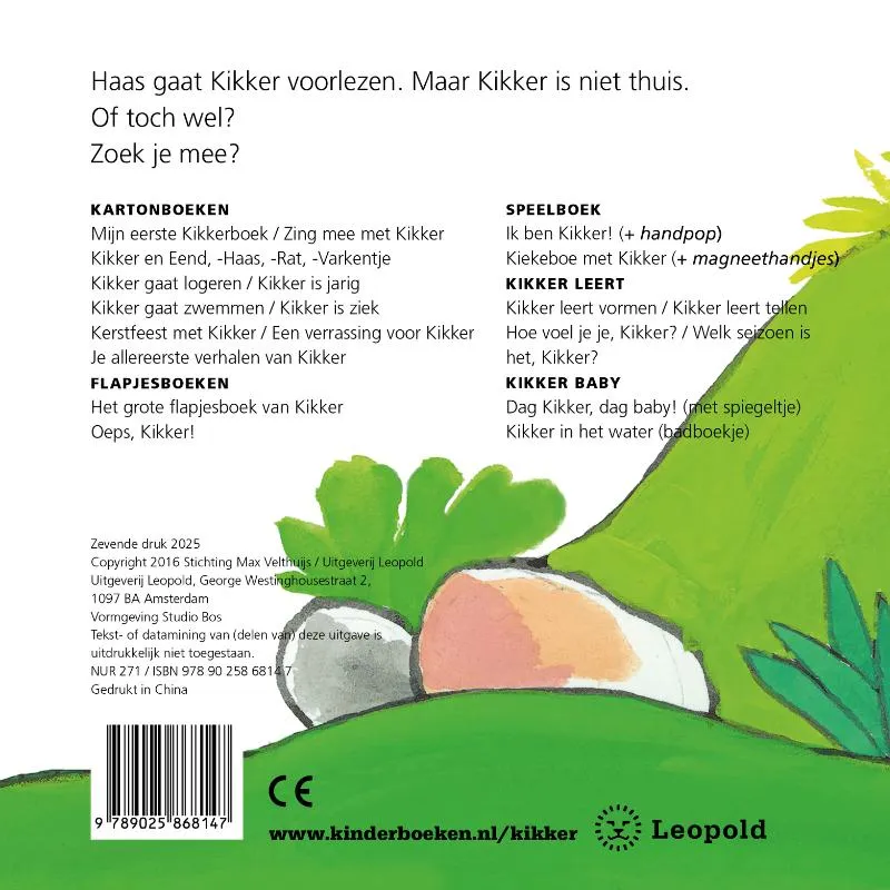 Haas gaat Kikker voorlezen.<br>Maar Kikker is niet thuis.<br>Of toch wel?<br>Zoek je mee?