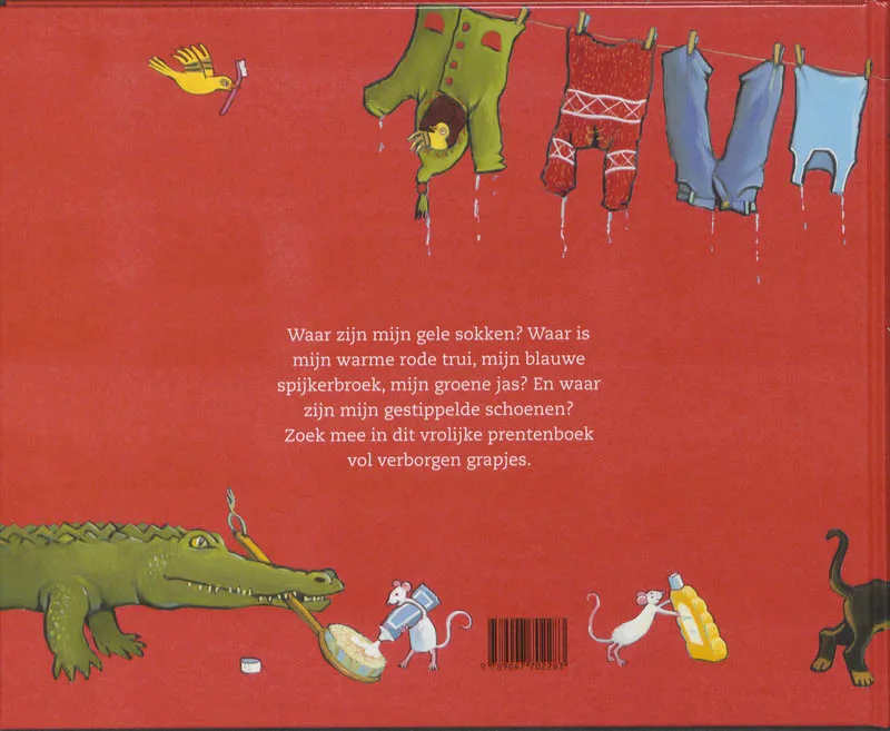 Een jongetje komt uit bad en zoekt zijn onderbroek, zijn blauwe spijkerbroek, zijn gestippelde schoenen en zijn rode jas. Ze zijn verstopt op pagina’s vol kledingstukken, waarop telkens terugkerende dieren en kinderen staan.