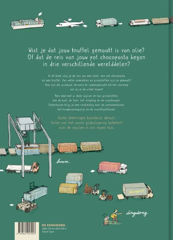 In dit boek volg je het maakproces van een stoel, een pot chocopasta en een knuffel. Van welke onderdelen en grondstoffen zijn ze gemaakt? Hoe zijn die allemaal vervoerd en samengebracht tot het voorwerp dat wij in de winkels vinden? Ga samen met deze spullen en hun grondstoffen op reis: je neemt de boot, de trein, het vliegtuig en de vrachtwagen. Ondertussen krijg je een rondleiding door de containerhaven, het hoogbouwmagazijn en de vrachtluchthaven.