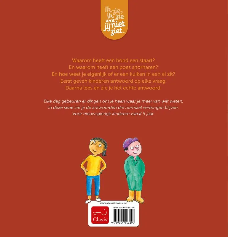 Waarom heeft een hond een staart? En waarom heeft een poes snorharen? En hoe weet je eigenlijk of er een kuiken in een ei zit? Eerst geven kinderen antwoord op elke vraag. Daarna lees en zie je het echte antwoord.