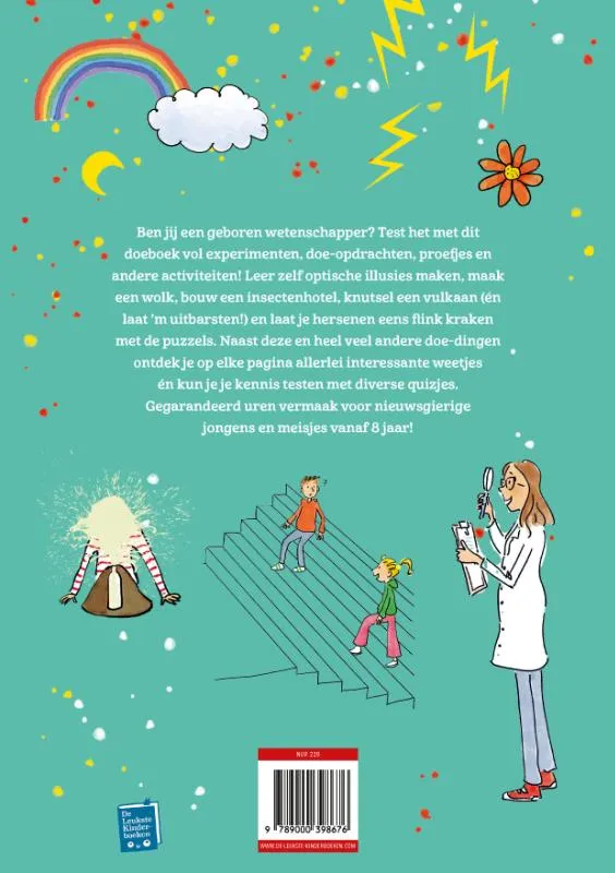 Ben jij een geboren wetenschapper? Test het met dit doeboek vol experimenten, proefjes en andere activiteiten! Leer zelf optische illusies maken, maak een wolk, doe de tandpasta-proef, bouw een insectenhotel, en knutsel een vulkaan (én laat ’m uitbarsten!). Naast deze en heel veel andere doedingen komen er op elke pagina wetenschappelijke weetjes aan bod én kun je je kennis testen met diverse quizjes.